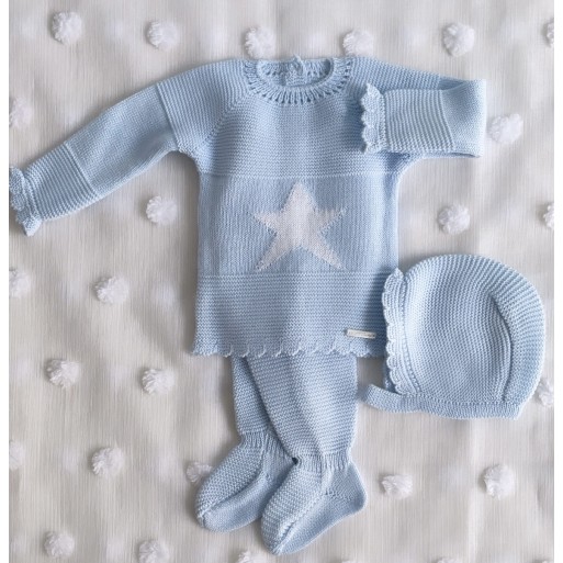 CONJUNTO DE HILO JERSEY,POLAINA Y CAPOTA ESTRELLA CELESTE